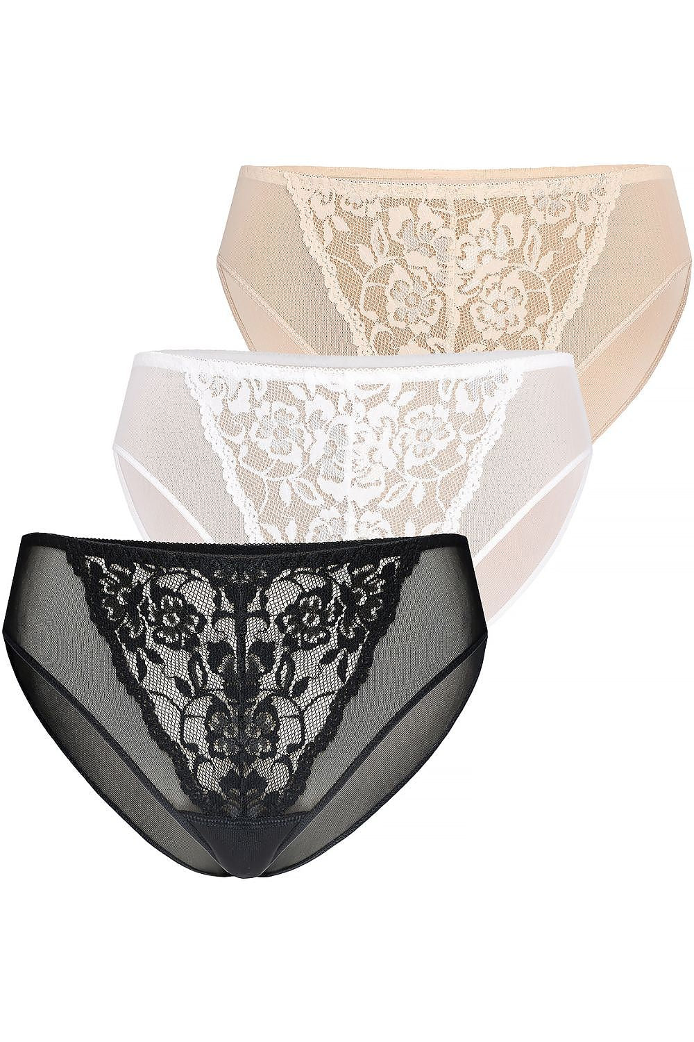 Multipack of women's classic panties in intense black color. The tri-pack of panties has a simple classic cut and is addressed to women of any figure regardless of shape and age. The sets are quite popular among women who appreciate comfort and convenience. In the front for a better visual effect and increase the quality of the panties are made of striking, delicate lace nice to the touch and for a woman's body with a distinctive floral motif. The panties at the back on the bottom are see-through, covering and at the same time sexily exposing the buttocks tempting the male eye. Delicate mesh adapts to the buttocks, does not divide them, does not press and does not leave marks on the body. The lace as well as the mesh are of high quality. The panties are very comfortable and convenient in everyday use and, when combined with a lacy soft bra, they create a striking classic black timeless set, in which every woman looks stunning. At the waist from the inside the panties are trimmed with a thin elastic band, the same thin band finishes the panties very aesthetically around the thighs, it does not stand out from under fitted clothing. In the crotch area from the inside the panties are lined with cotton, which guarantees freshness and breathability.